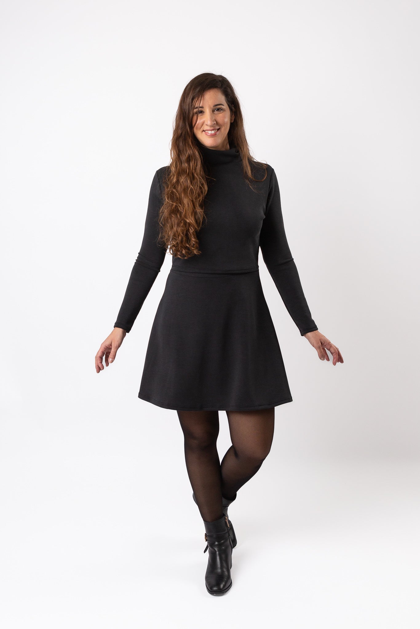 Coco Chanel dijo que toda mujer debía tener un little black dress en su fondo de armario, y esta es nuestra versión para madres lactantes. Su sofisticado cuello cisne y la falda acampanada crean un look elegante y favorecedor, mientras que el tejido sedoso tipo cupro aporta confort y elegancia, perfecto para cualquier fiesta o celebración formal.